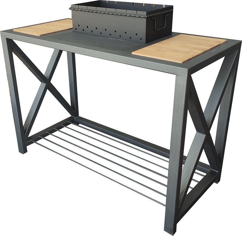 Описание: Мангал состоит из основания (каркаса) и жаровни, покрытой термостойкой краской. В боковых стенках жаровни предусмотрены специальные пазы для удобства и постановки шампуров и специальные отверстия которые обеспечивают оптимальный приток воздуха. Материал изготовления каркаса - труба профильная 60х40х2 мм, жаровня - сталь толщиной - 3 мм. Боковые подставки из пиломатериалов хвойных пород с пропиткой защитным маслом. Низ - сталь круглая D10 мм.